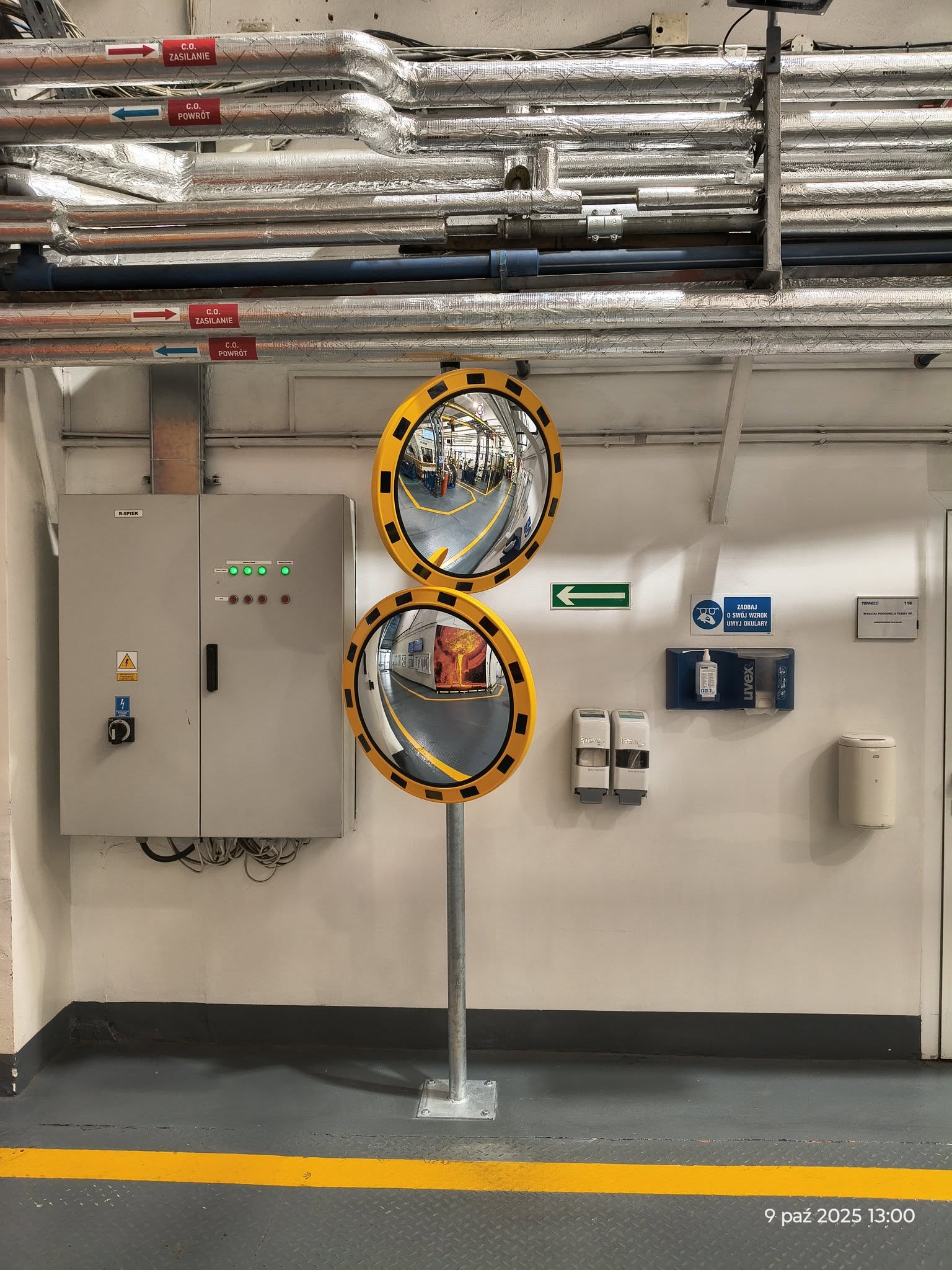 Lustro przemysłowe, magazynowe z ramą ostrzegawczą.