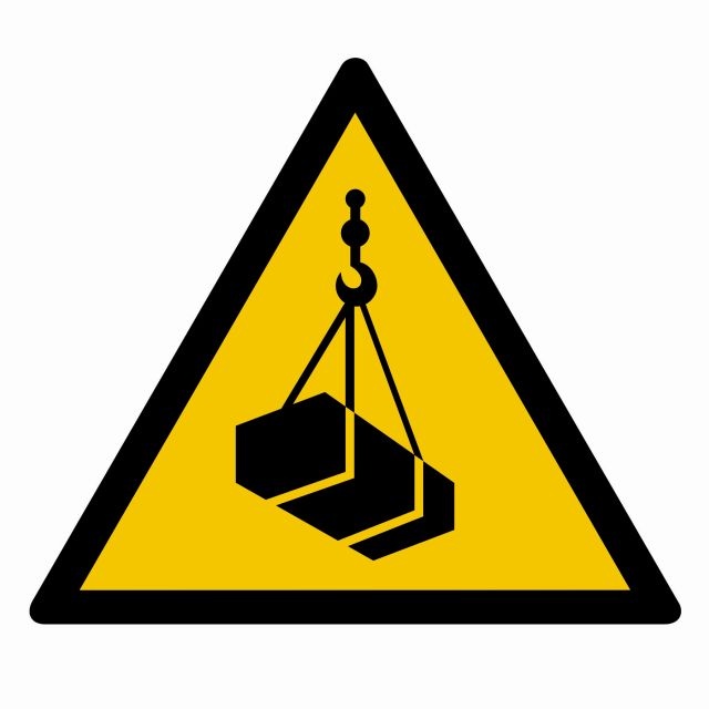 Znak Ostrzeżenie przed wiszącym ciężarem (wiszącymi przedmiotami)