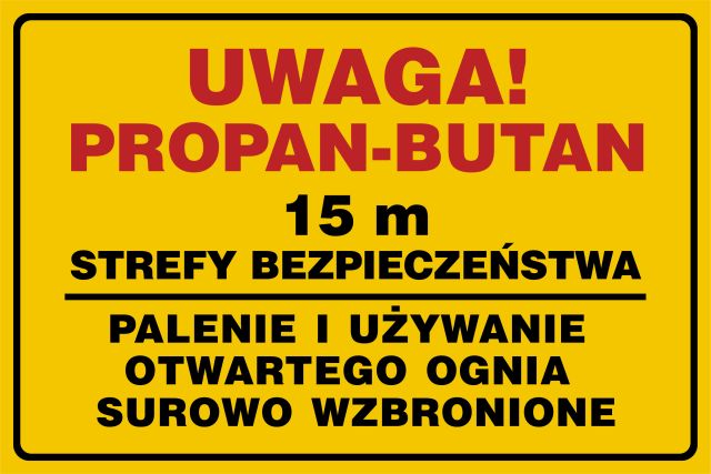 Znak Uwaga!Propan-butan15m strefy bezpieczeństwa